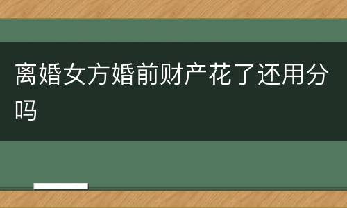 女方的婚前财产,离婚时不用分割,婚前财产是归个人所有的,不在离婚财产的分割范围内,夫妻俩结婚之后获得的财产,属于婚内共同财产,归夫妻双方共同所有,若办离婚手续需要平均分割。