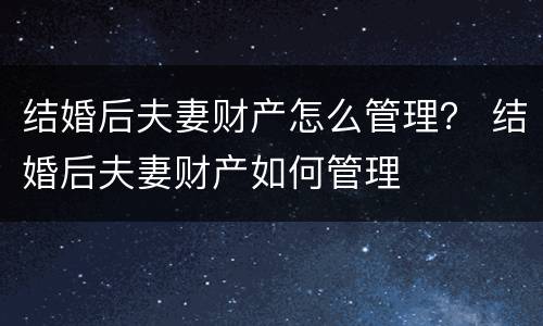 结婚后夫妻财产怎么管理由双方当事人协商确定。但是实际上涉及到夫妻共同财产方面的一些问题,双方当事人都是有平等的权利的权利的,所以如果是属于大额财产的转移的情况之下,是需要双方当事人共同协商来进行处理。