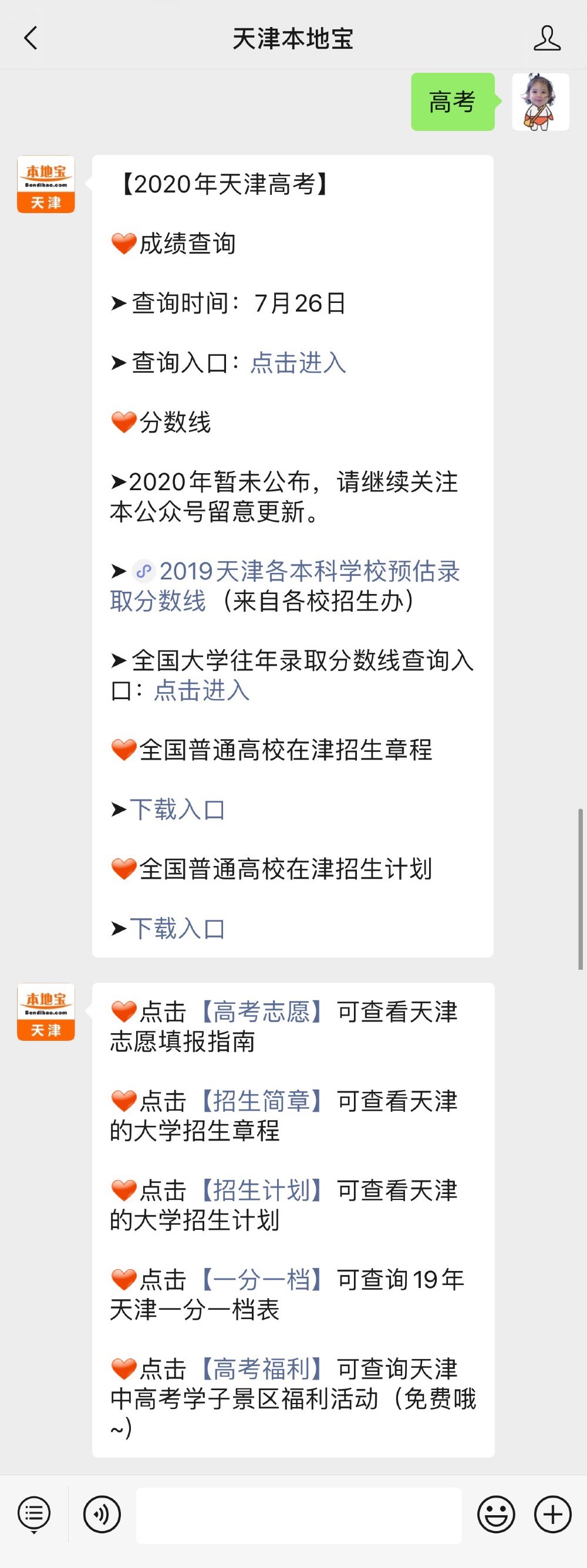 温馨提示:微信搜索关注公众号【天津本地宝】,对话框回复【高考】,获取2020天津高考成绩查询入口,全国高校往年在天津录取分数线查询入口,一分一档表,在津大学招生简章、招生计划、志愿填报指南等信息。