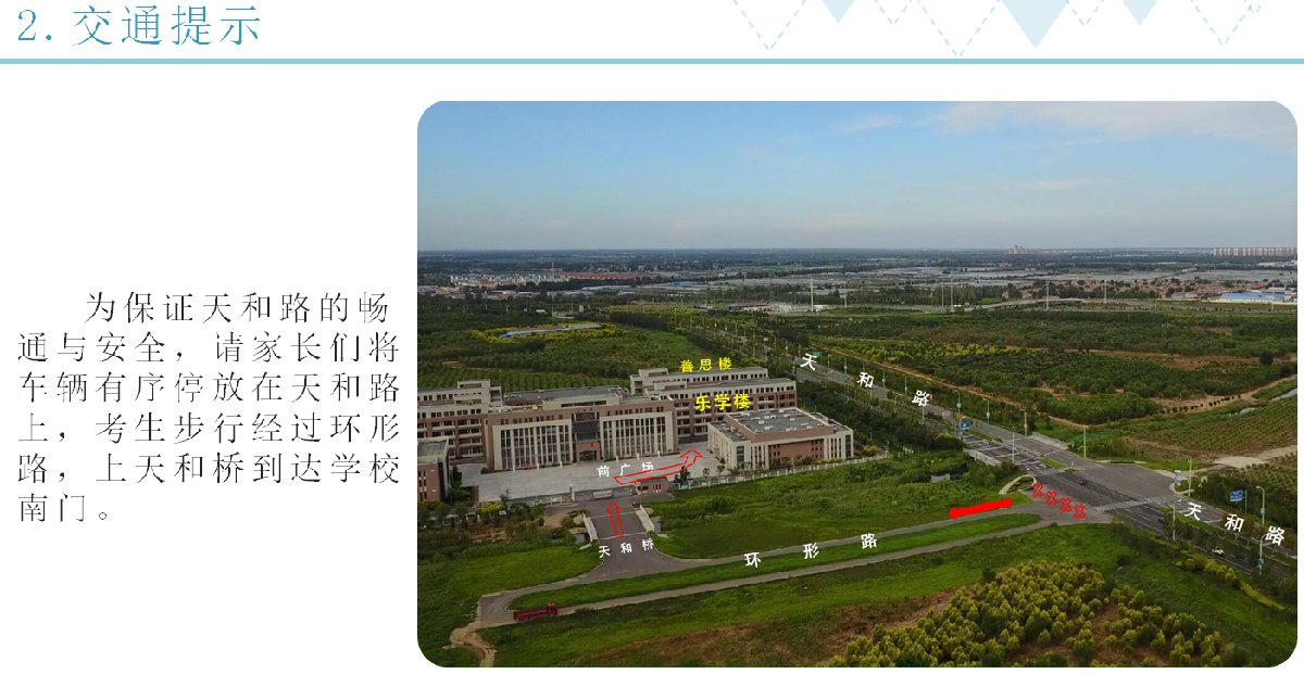 02 交 通 提 示为 保 证 交 通 畅 通 与 安 全 , 请 家 长 们 将 车 辆 有 序 停 放 在 考 点 500 米 以 外的 地 方 。考 生 步 行 经 过 泉 尚 路 从 北 门 进 入 考 点 。