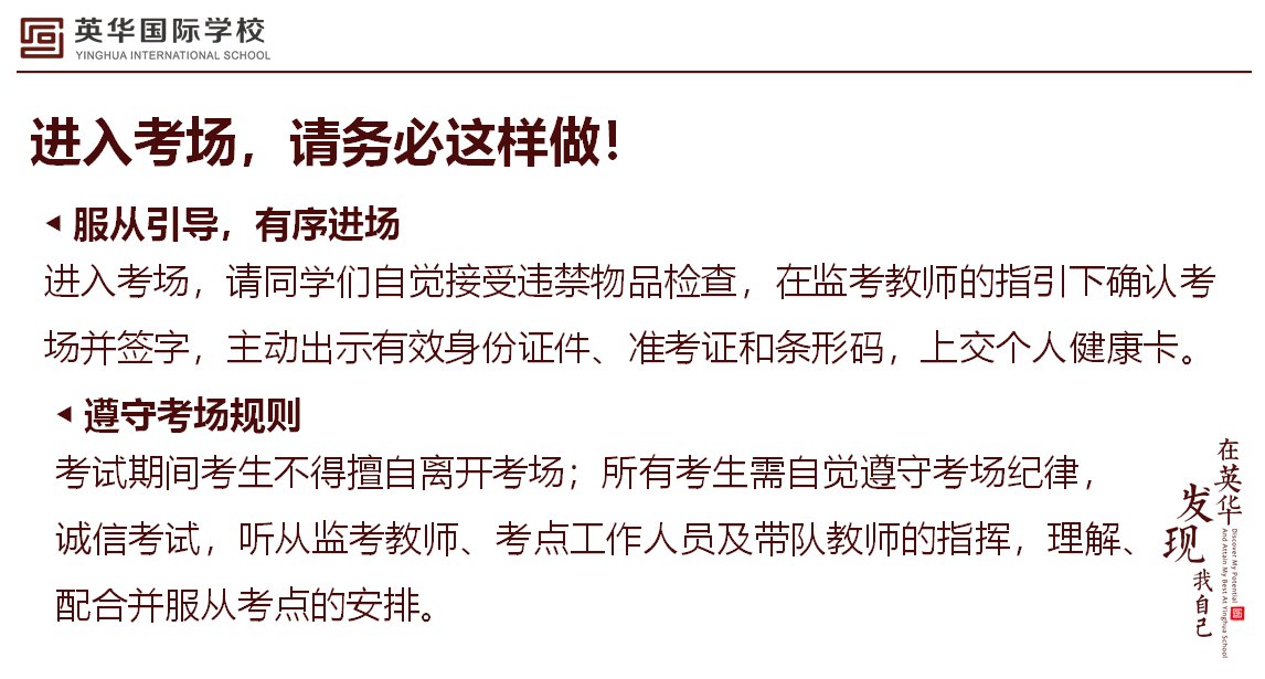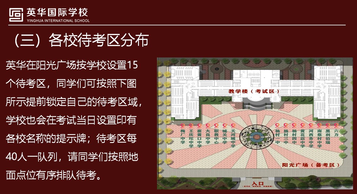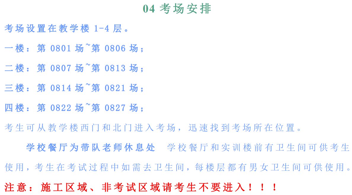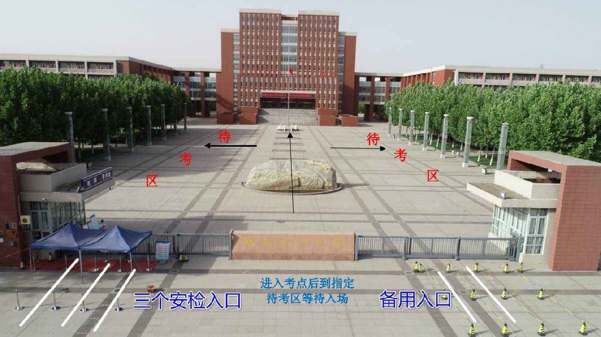 考 生 进 入 考 点 后 以 考 生 校 为 单 位 进 入 待 考 区 域 等 待 , 接 到 指 令 后 方 可进 入 考 场 。待 考 区 域 分 别 设 置 在 宿 舍 楼 和 第 二 教 学 楼 前 。考 生 进 入 待 考 区后 , 请 把 手 机 等 电 子 产 品 上 交 给 自 己 学 校 的 带 队 老 师 , 严 禁 带 入 考 场 区域 。