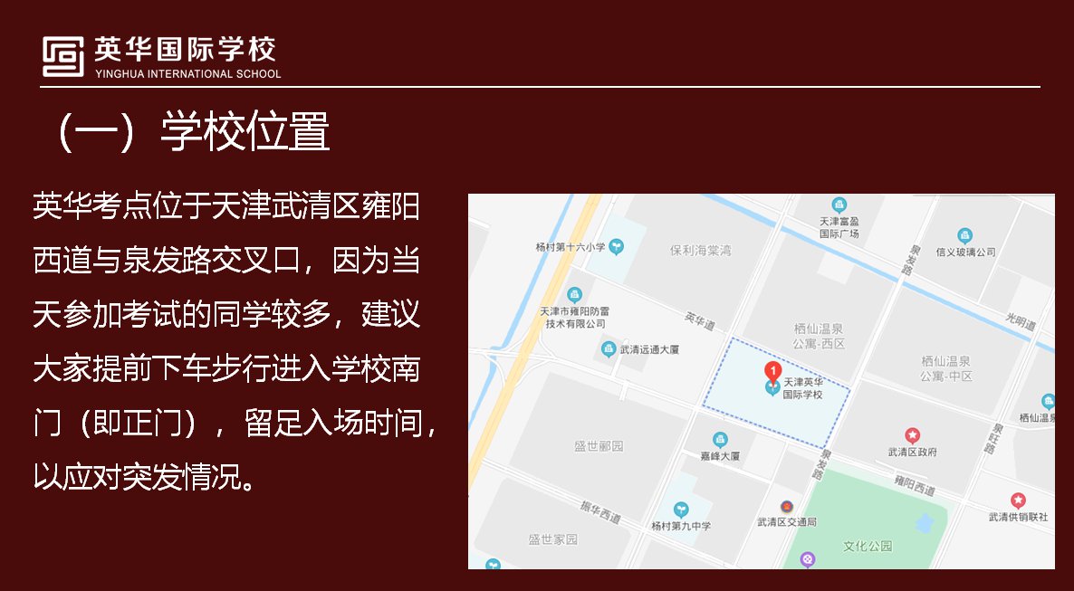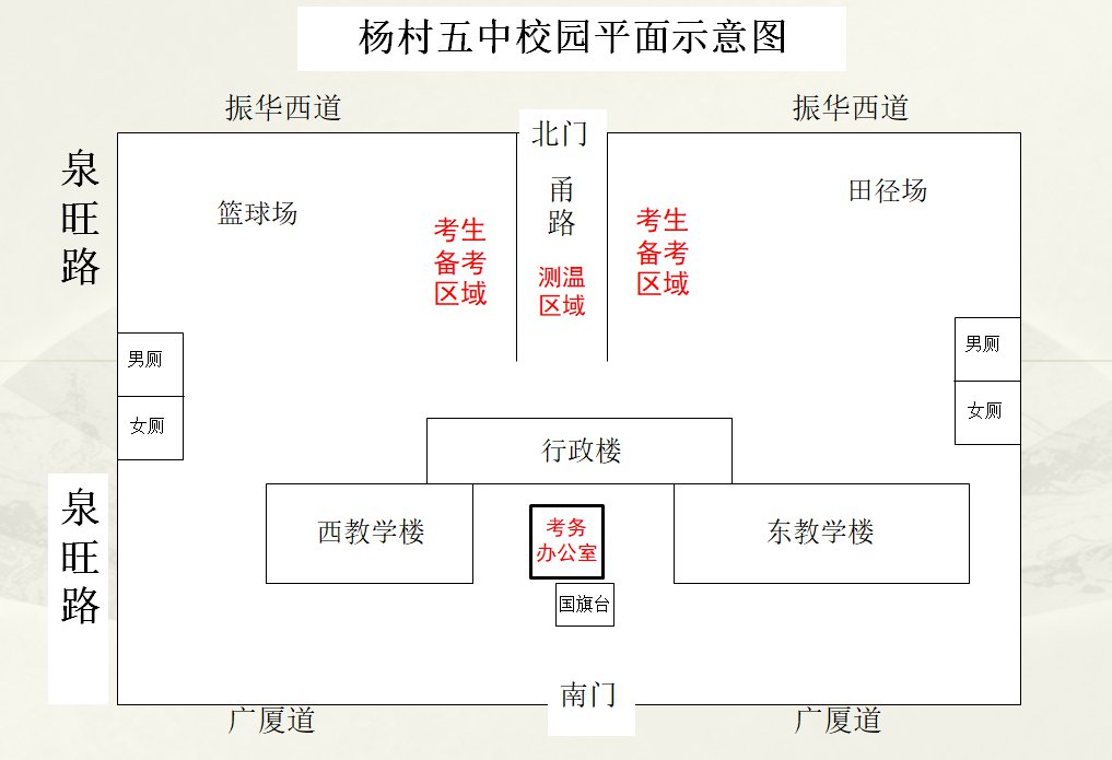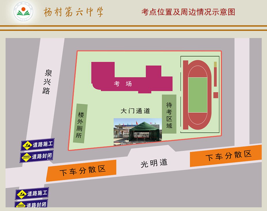 01 杨 村 四 中 考 点 地 址杨 村 四 中 ( 新 址 ) 坐 落 在 建 设 路 与 泉 尚 路 交 口 处 ( 原 黄 庄 职 专 校 址 ),您 可 以 直 接 百 度 导 航 搜 索 “ 杨 村 四 中 ” 即 可 。考 生 可 以 进 入 考 点 , 考生 进 入 考 点 时 主 动 配 合 体 温 检 测 。