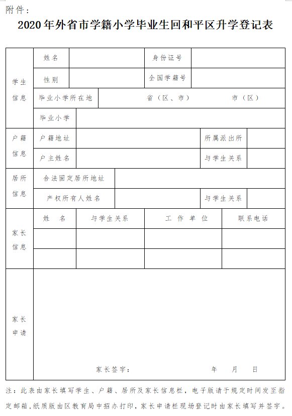 (3)《2020年外省市学籍小学毕业生回和平区升学登记表》(附件)