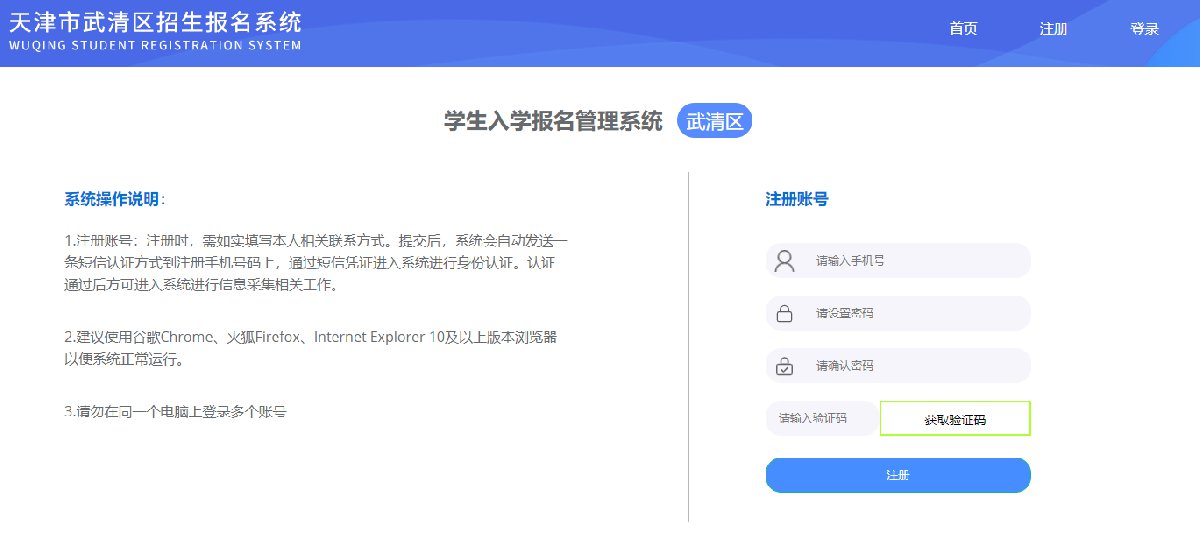武清区招生报名系统包含报名信息展示、报名通道、查看报名进度三个模块,方便家长查阅相关的招生报名信息、填写并提交报名资料、详细了解报名进度情况。家长可通过访问武清区招生报名系统门户网站链接到系统注册和登录界面。