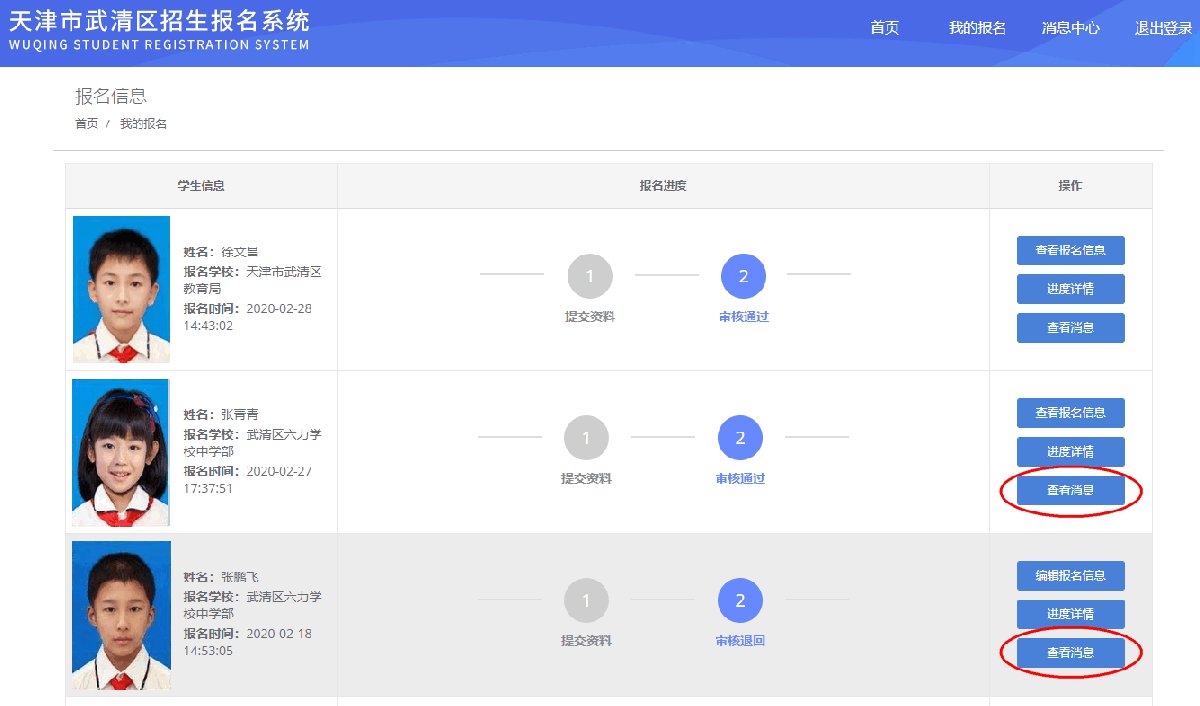 (4)对于审核通过和审核退回的报名信息,家长可点击“查看消息”按钮,跳转至消息中心页面,查看由所报幼儿园发送的报名资料审核通知。