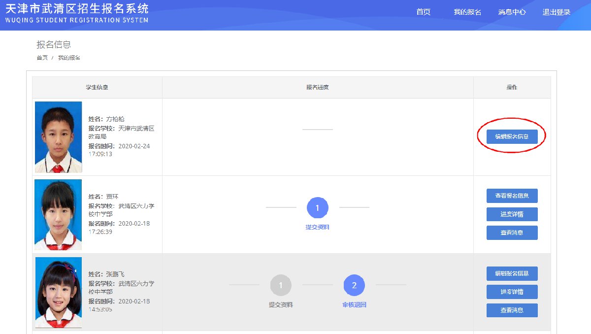 (3)由于报名资料填写有误,审核后被退回的报名信息,家长可点击“编辑报名信息”按钮,重新编辑报名资料,完成提交,等待再次审核。