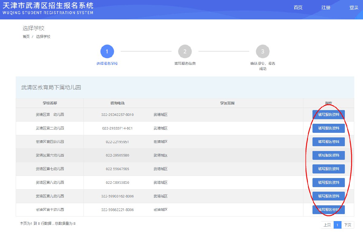 4、第四步:家长可在此页面查看武清教育局下属公办幼儿园列表,并根据实际情况选择对应幼儿园,点击“填写报名资料”按钮。