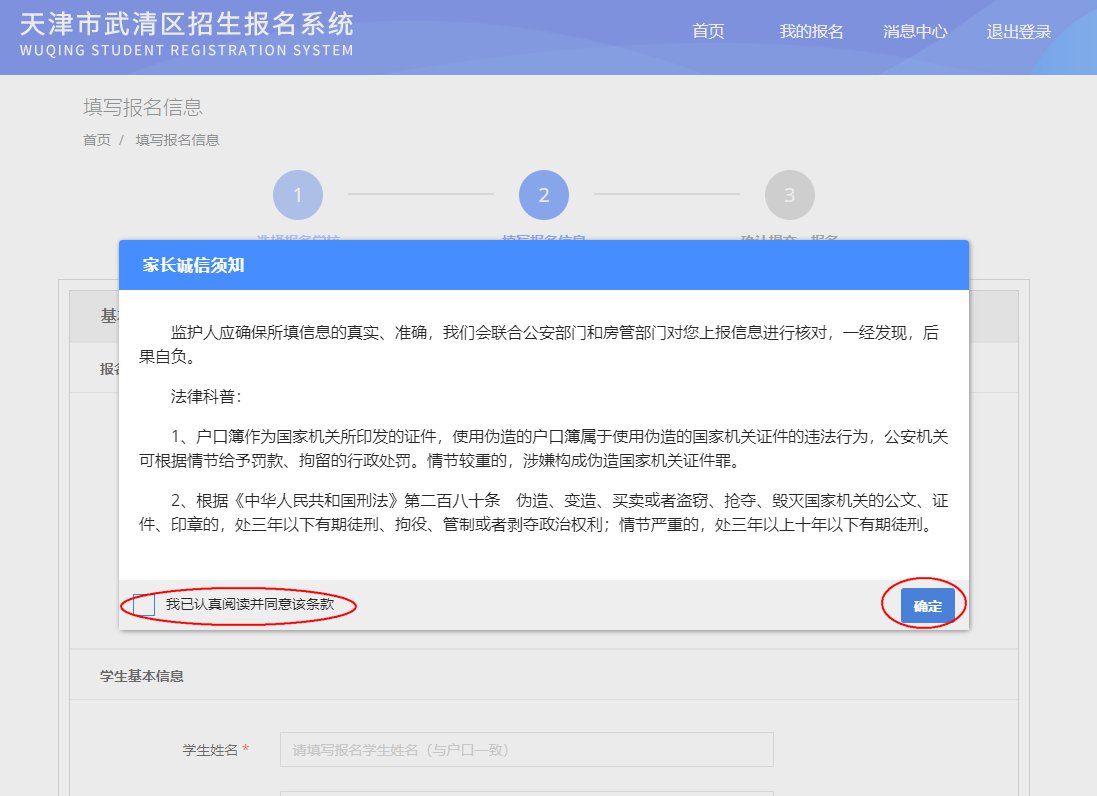 6、第六步:阅读“家长诚信须知”,勾选确认框,点击“确认”按钮。