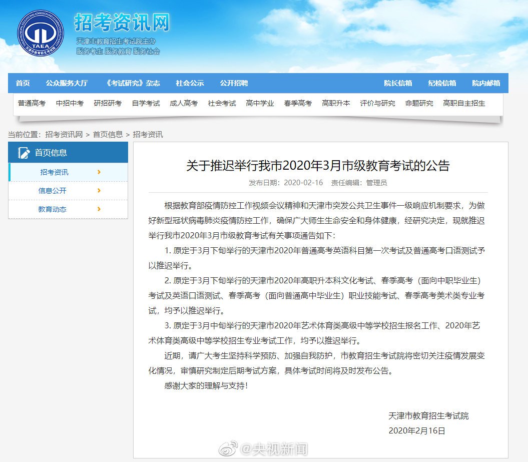 原定于3月下旬举行的天津市2020年高职升本科文化考试、春季高考(面向中职毕业生)考试及英语口语测试、春季高考(面向普通高中毕业生)职业技能考试、春季高考美术类专业考试,均予以推迟举行。