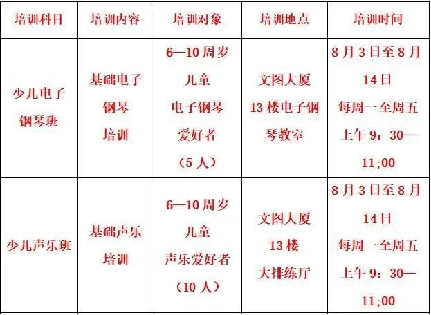 2020年夏季暑期免费少儿培训班(第二期)课程表
