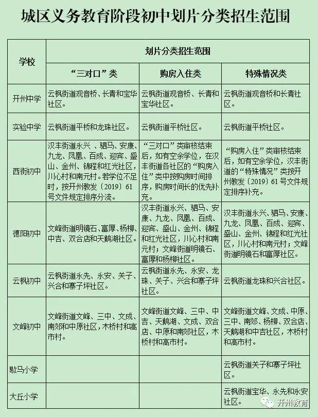 西街初中:“购房入住”类审核结束后,如有空余学位,汉丰街道的“特殊情况”类按“开州教发〔2019〕61号”文件规定排序补充。