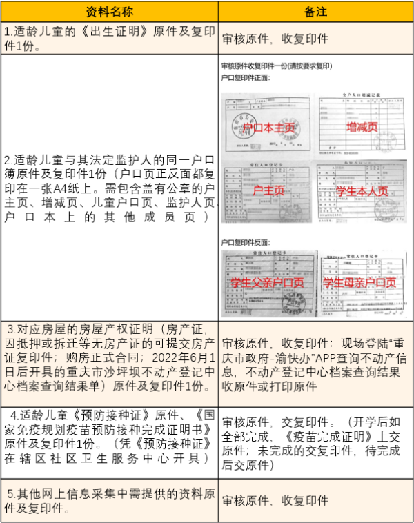 2.网上提交资料为适龄儿童的《出生证明》、适龄儿童与其法定监护人的同一户口簿、房产证原件,如房产证抵押的可上传房产证复印件、重庆市沙坪坝不动产登记中心档案查询结果单(需要上传2022年6月份的)。