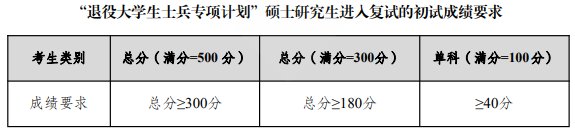 “退役大学生士兵专项计划”硕士研究生进入复试的初试成绩要求