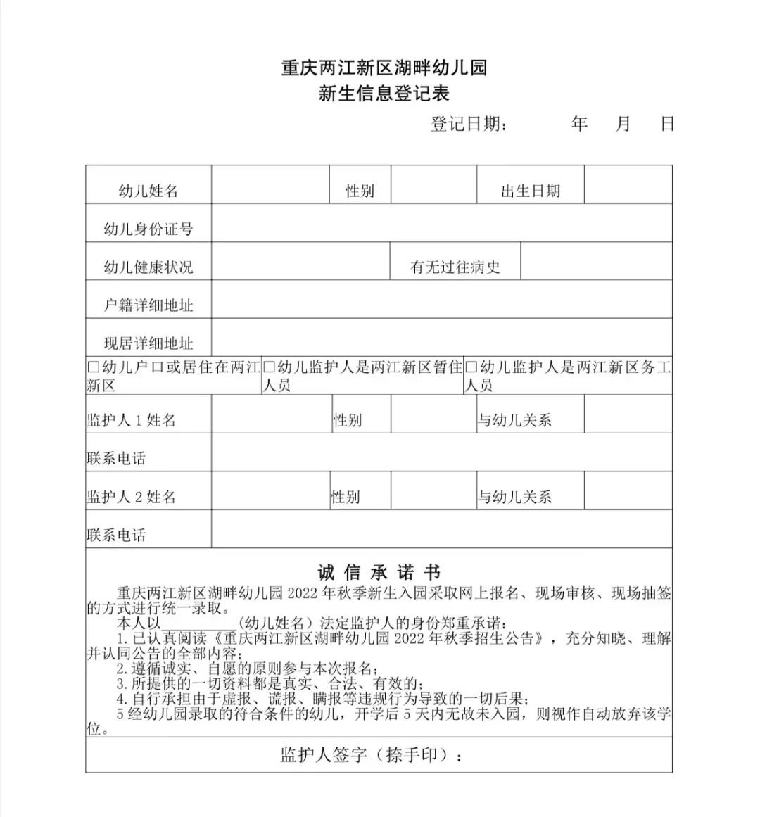 注:下载打印附件——《重庆两江新区湖畔幼儿园新生信息登记表》 《疫情防控个人健康信息承诺书》,并如实填写,于核实信息当日同幼儿资料一起审核。