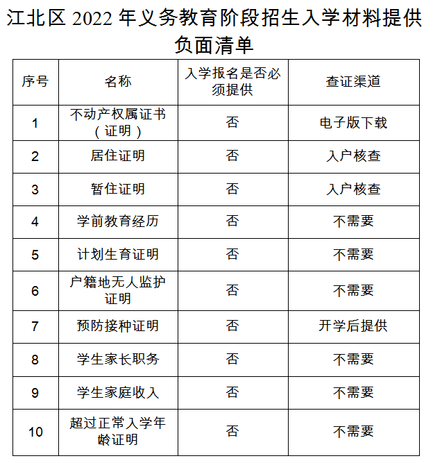 全面落实《教育部办公厅关于进―步做好普通中小学招生入学工作的通知》(教基厅〔2022〕1号)工作要求,按照材料非必要不提供、信息非必要不采集原则,实行“江北区 2022年普通中小学招生入学材料提供负面清单"制度,推进不动产登记等各项便民利民措拖落实,践行“我为群众办实事”,让数据多跑路,群众少跑路或不跑路。