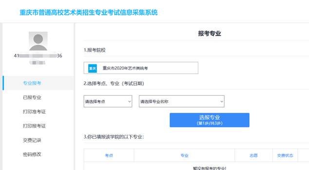 确认信息完成后就直接跳转至艺术类招生专业考试信息采集系统的主界面。