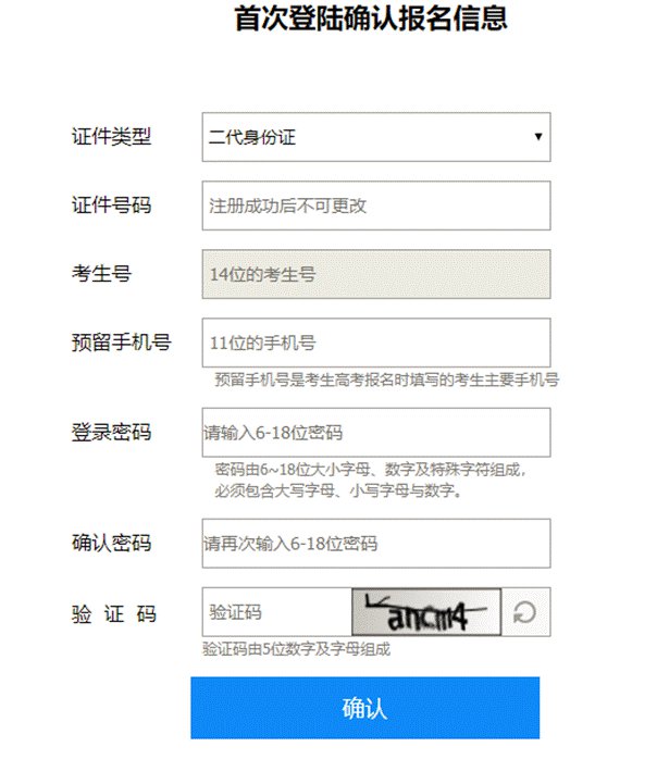 在信息确认页面,考生须选择自己证件类型、并依次填写本人证件号,补全预留手机号(高考报名时填写的考生主要手机号)后四位,设置登录密码和确认密码后,确认信息无误以后点击【确认】。