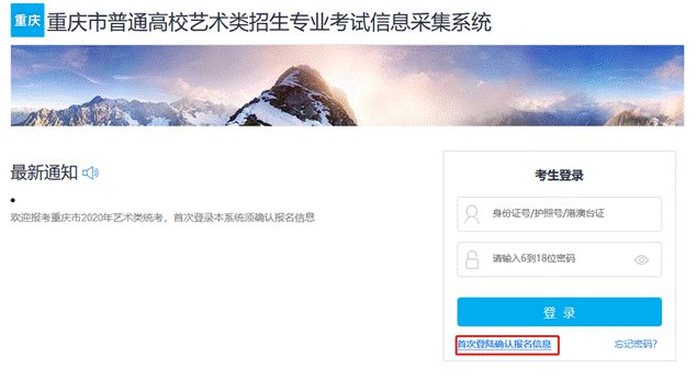 进入登陆页面以后,如果是第一次进入重庆市艺术类招生专业考试信息采集系统,请点击页面右下方的“首次登录确认信息”按钮进行信息确认。