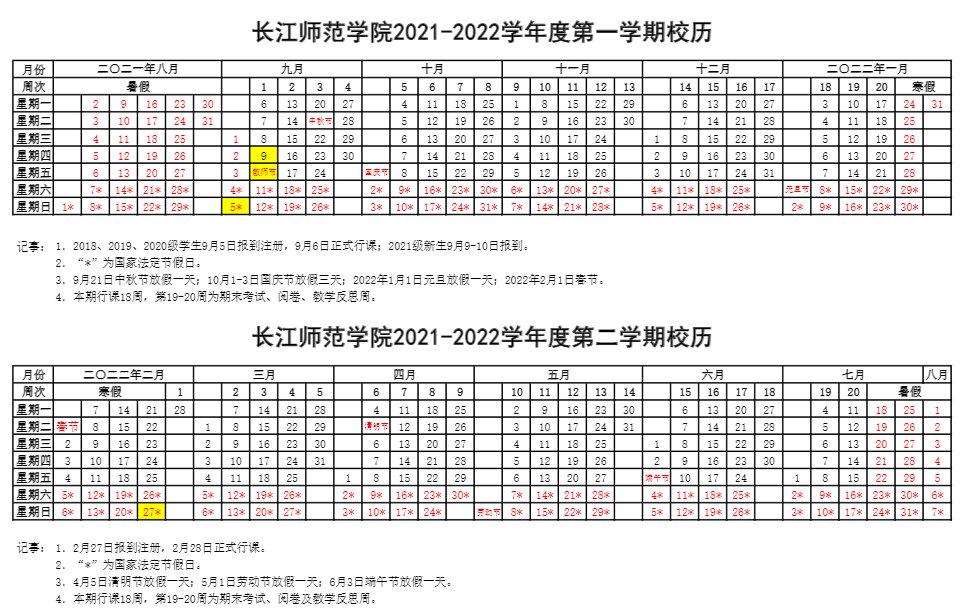 重庆长江师范学院2021—2022学年第一学期(共20周)