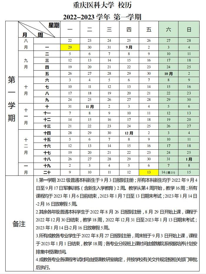 重庆医科大学2022—2023学年第一学期(共20周)