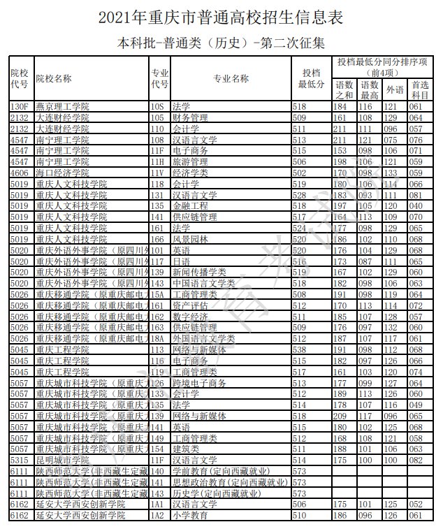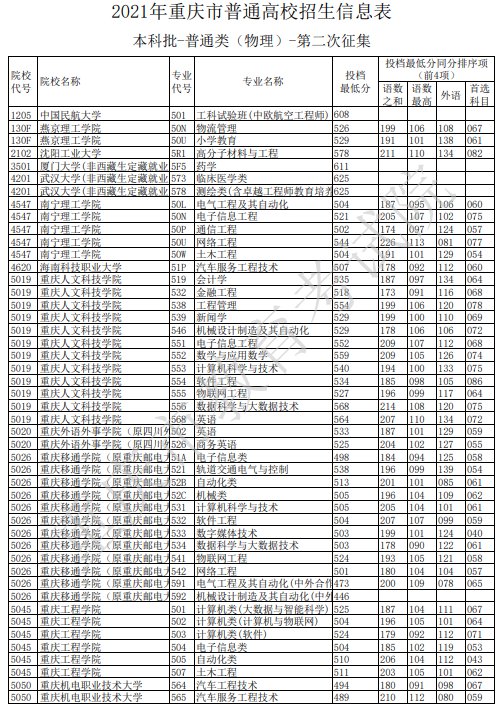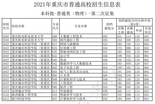 2021年重庆市普通高校招生信息表本科批普通类物理、历史类考生第二次征集志愿投档最低分已出炉: