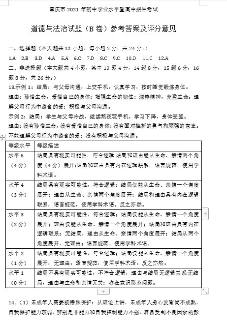 2021年重庆中考道德与法治 2021年重庆中考道德与法治答案