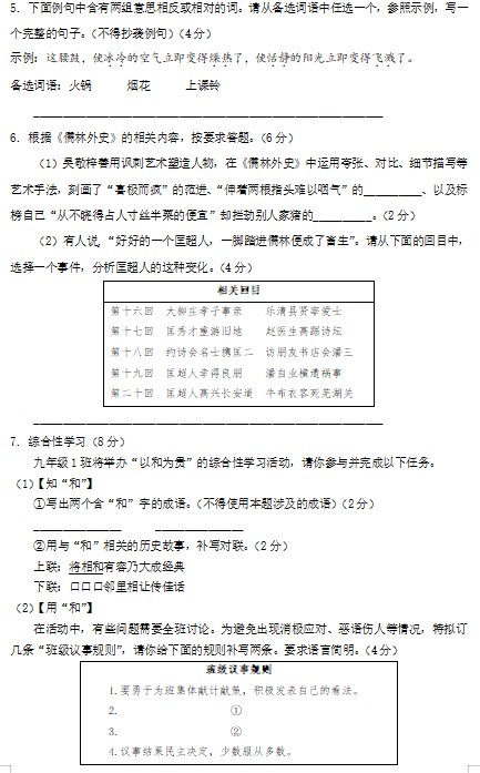 试题将社会主义核心价值观、中华优秀传统文化等融于试卷,让学生潜移默化受熏陶。以“综合性学习”考查为例,涵盖了教材上的“君子自强不息”和“以和为贵”两个专题。
