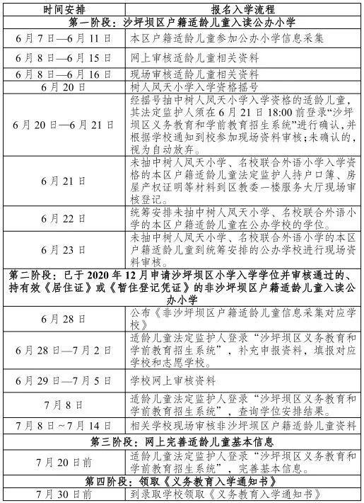 30.2021年,沙坪坝区民办小学一年级入学学位申请、信息采集、学位安置、报名入学等时间是如何安排的?答: