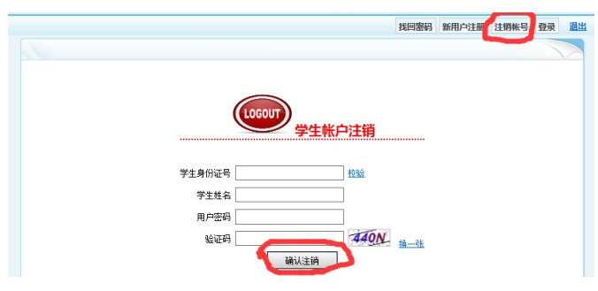 如果不小心将学生身份证号填写错误又完成了注册,需要重新注册时可以注销原来注册的错误账号(审核通过的不能注销)。点击“注销账号”,输入注册时的“身份证号、姓名、用户密码、验证码”后点击“确认注销”,就可以完成账号注销。如下图: