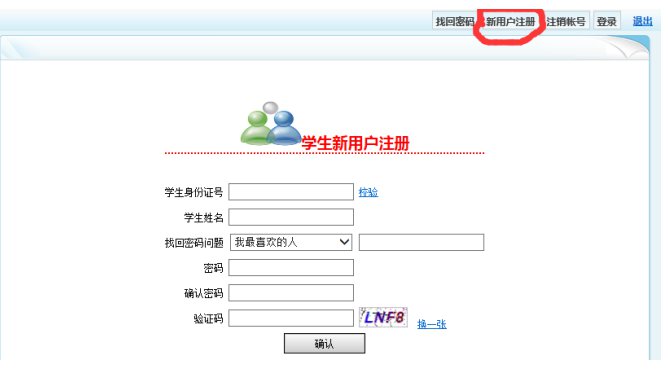 在首页右上角点击“新用户注册”,输入“学生身份证号、姓名、找回密码问题、输入密码、确认密码、输入验证码”等内容确认,即完成注册,就可以进行登录了。如下图:
