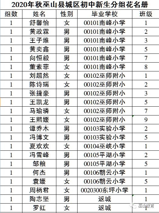 1组学生的分校抓阄结果是巫峡初中,所以该同学的分班分校结果为:巫峡初中1班。