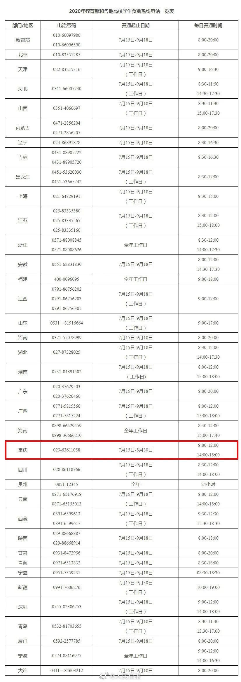 2020年教育部和重庆高校学生资助热线电话一览表