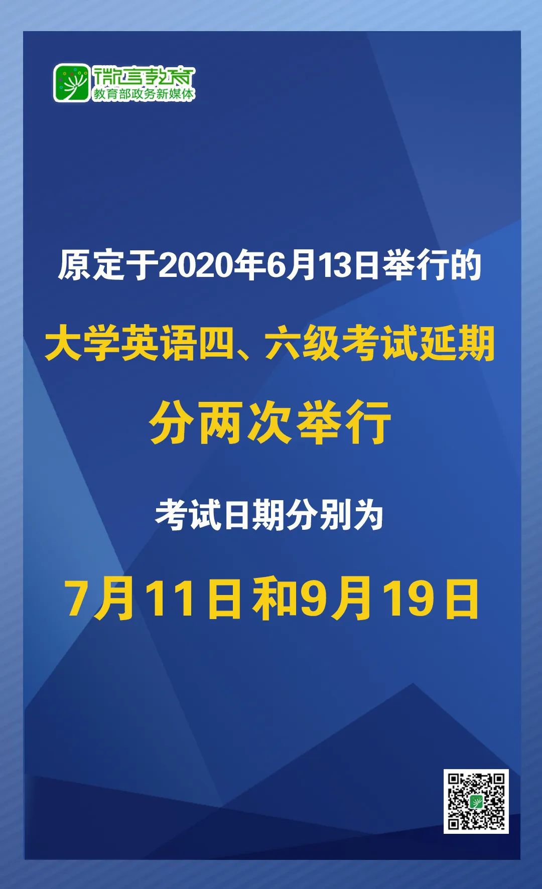 根据党中央、国务院关于新冠肺炎疫情防控工作的有关精神,经研究决定,原定于2020年6月13日举行的全国大学英语四、六级考试延期并分两次举行,考试日期分别为7月11日和9月19日。各高校可以根据复学复课实际情况及当地卫生防疫要求向省级考试机构提出考试申请,经批准后,组织一次或者两次考试。同一考生同一级别只能选择参加一次考试。具体报名时间以各省级考试机构公布为准。