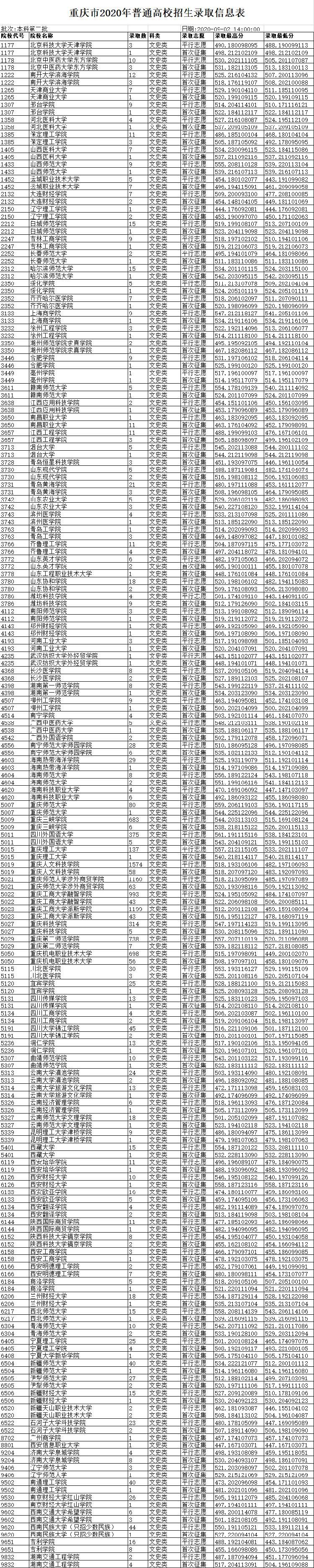 2020年高考二本录取信息:文史类: