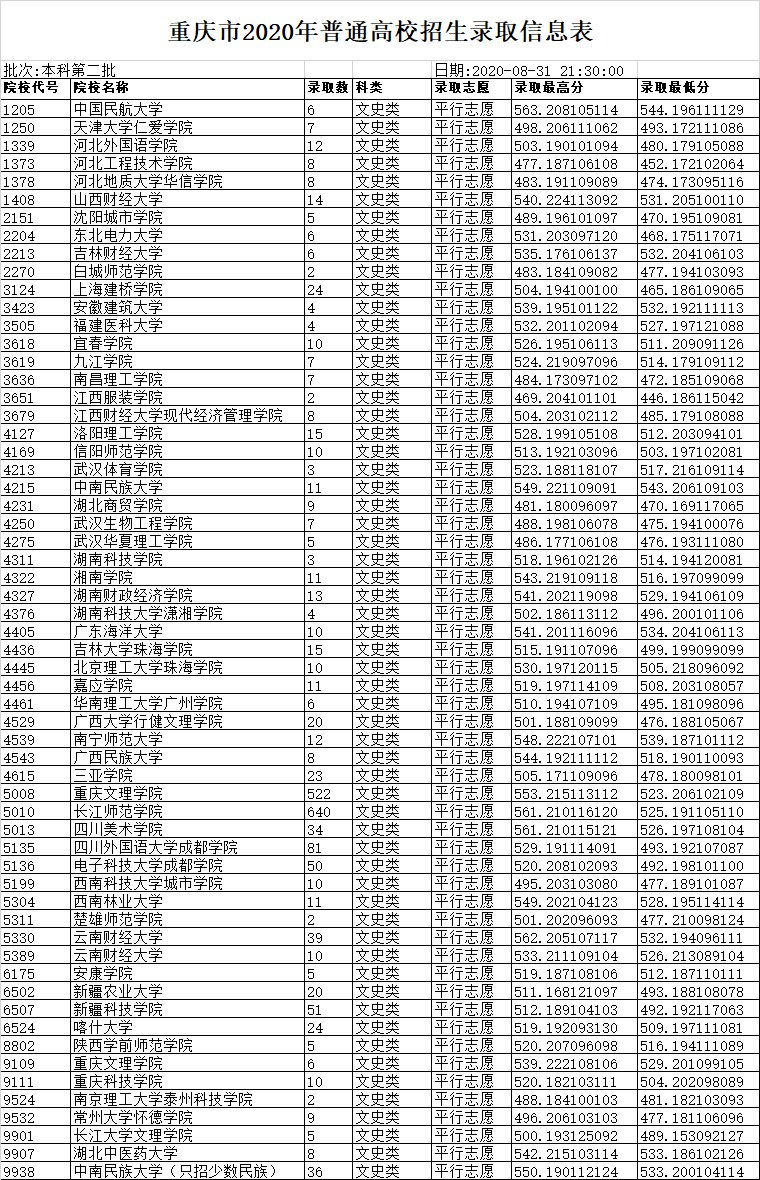 重庆市2020年普通高校招生录取信息表