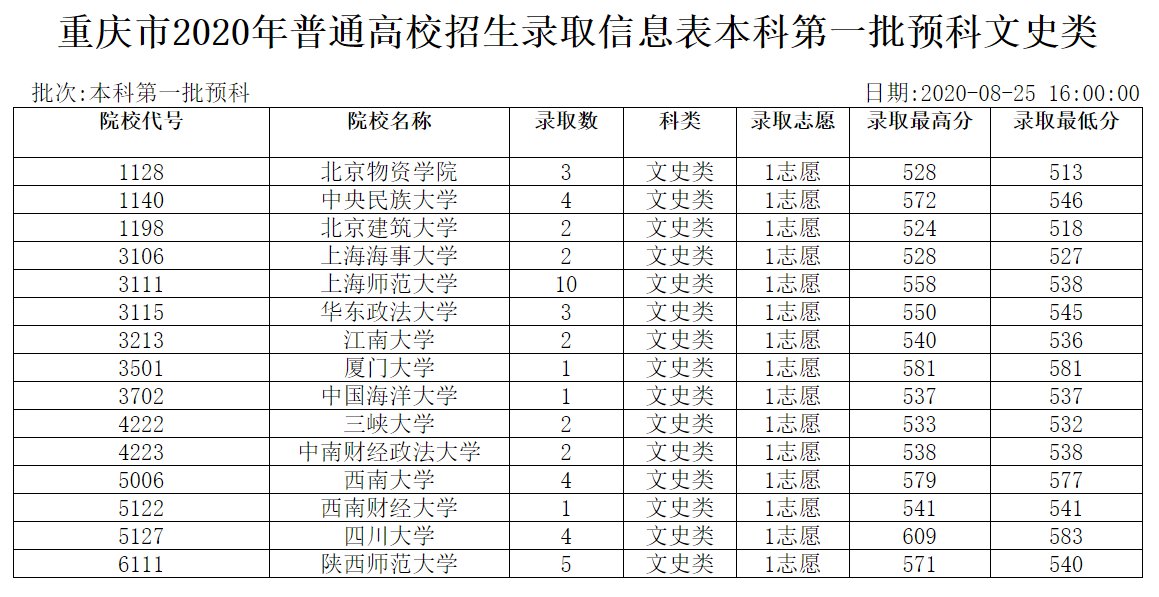 一、重庆市2020年普通高校招生录取信息表(本科第一批预科文史类)