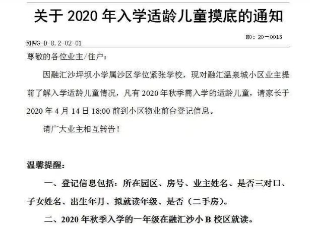 因融汇沙坪坝小学属沙区学位紧张学校,现对融汇温泉城小区业主提前了解入学适龄儿童情况,凡有2020年秋季需入学的适龄儿童,请家长于2020年4月14日18:00前到小区物业前台登记信息。