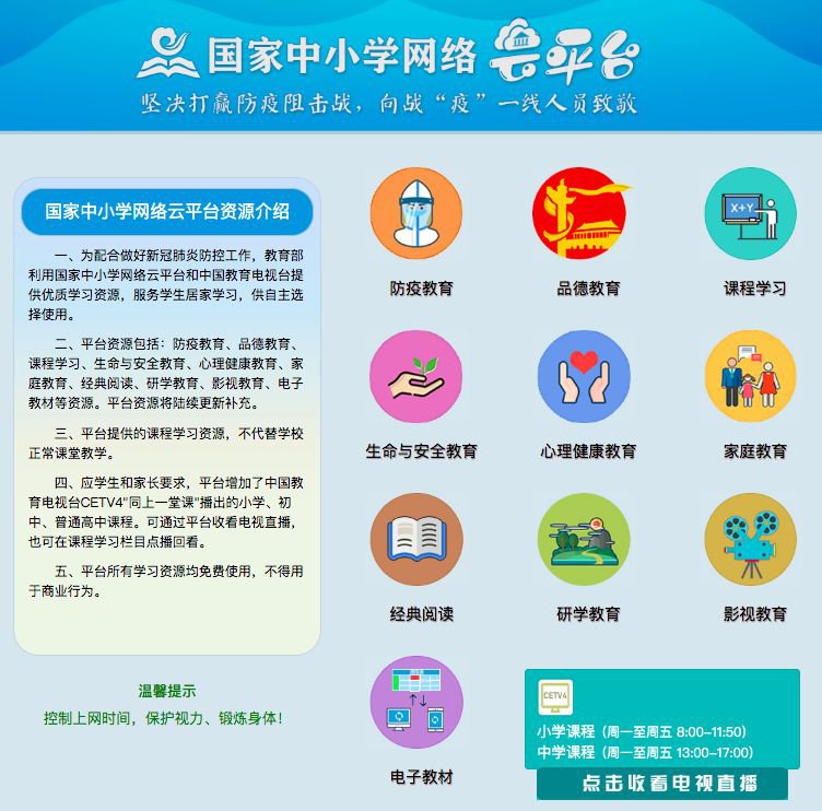 2月24日,升级后的平台投入使用,升级后的平台资源除了课程学习,还包括防疫教育、品德教育、生命与安全教育、心理健康教育、家庭教育、经典阅读、研学教育、影视教育、电子教材等10个版块,并更新补充了部分内容,供师生自主选择使用。