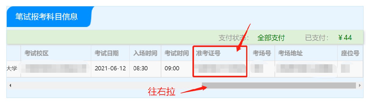 步骤五:进入报名信息页面,下滑至“笔试报考科目信息”,右拉水平滚动条即可查看准考证号。