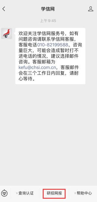 现在,考虑疫情期间,招生单位跟考生沟通渠道不畅,研招网为了方便遗失考研准考证的考生查初试成绩,也帮助丢失准考证的考生顺利复试,从2月15日开始,研招网再次开通下载《准考证》功能,考生可使用微信绑定自己的学信网账号,直接在“学信网服务号(微信号:chsi_chesicc)-研招网报”菜单栏里点击下载准考证。