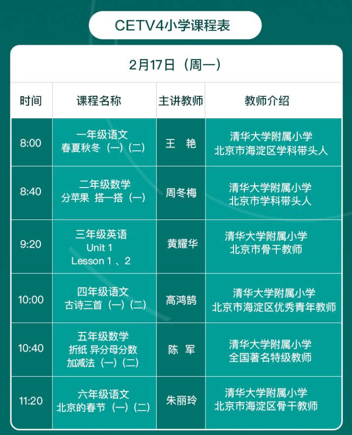 2月17日起中国教育电视台四频道(CETV4)推出大型《同上一堂课》“课表式电视课堂”,内容包括小学各年级直播课堂、部分中学课程,人文历史、国学经典、艺术欣赏、生命安全等通识教育,以及疫情防护、课间操、校园歌曲MV等文体科普教育等三大节目版块。电视课堂汇聚全国优质示范教学资源,主要覆盖小学各阶段课程,兼顾初三和高三学生的学习,同时汇聚大量历史人文及生命安全教育等优质节目内容,以模块化电视节目的编排方式,激发学生们的爱国主义情怀,培养学习兴趣,教授学习方法。