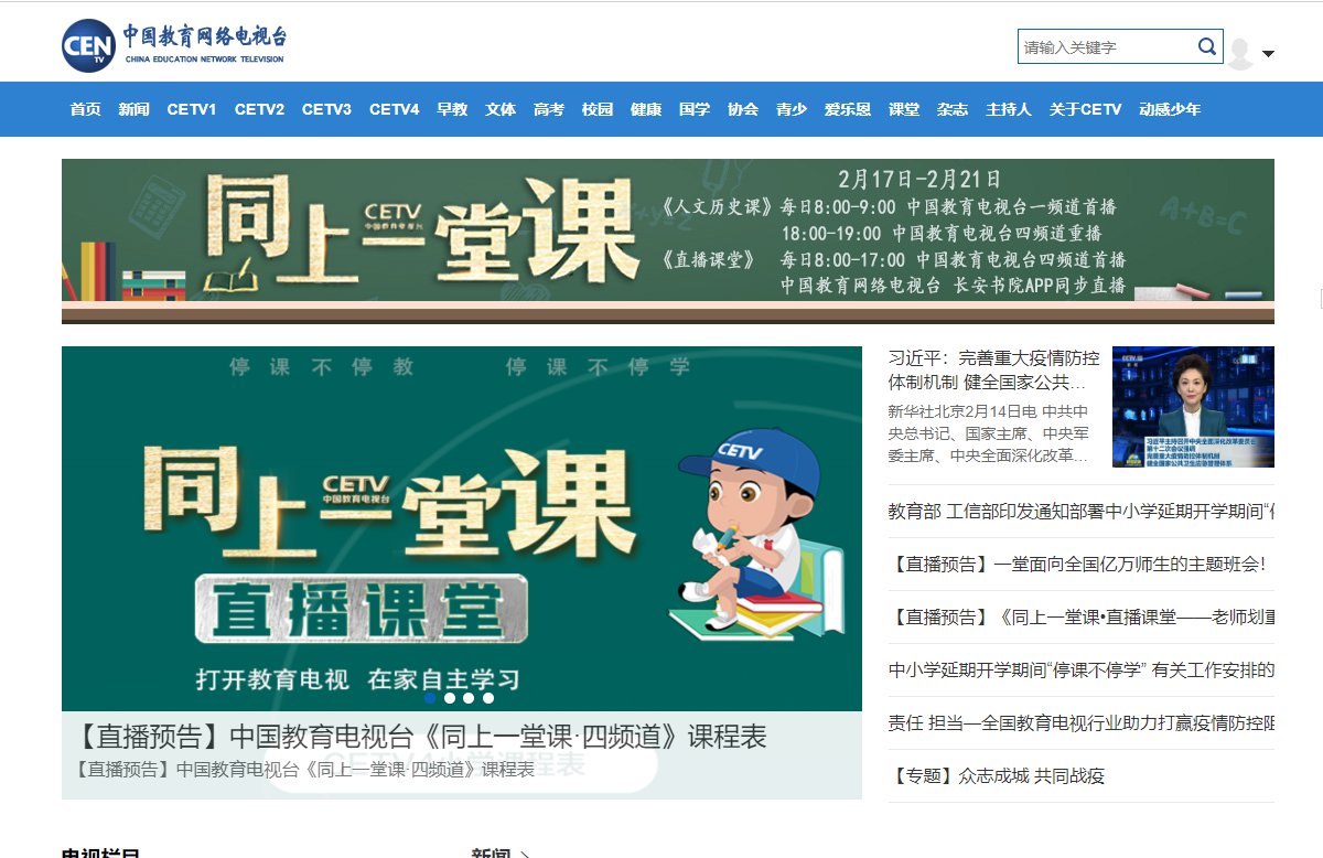 2月17日起中国教育电视台四频道(CETV4)推出大型《同上一堂课》“课表式电视课堂”,内容包括小学各年级直播课堂、部分中学课程,人文历史、国学经典、艺术欣赏、生命安全等通识教育,以及疫情防护、课间操、校园歌曲MV等文体科普教育等三大节目版块。电视课堂汇聚全国优质示范教学资源,主要覆盖小学各阶段课程,兼顾初三和高三学生的学习,同时汇聚大量历史人文及生命安全教育等优质节目内容,以模块化电视节目的编排方式,激发学生们的爱国主义情怀,培养学习兴趣,教授学习方法。电视信号通过直播卫星平台向全国各地传输,特别覆盖偏远贫困地区和网络信号比较弱及有线电视没有通达的地区,解决这些地区学生的学习资源和学习渠道问题。