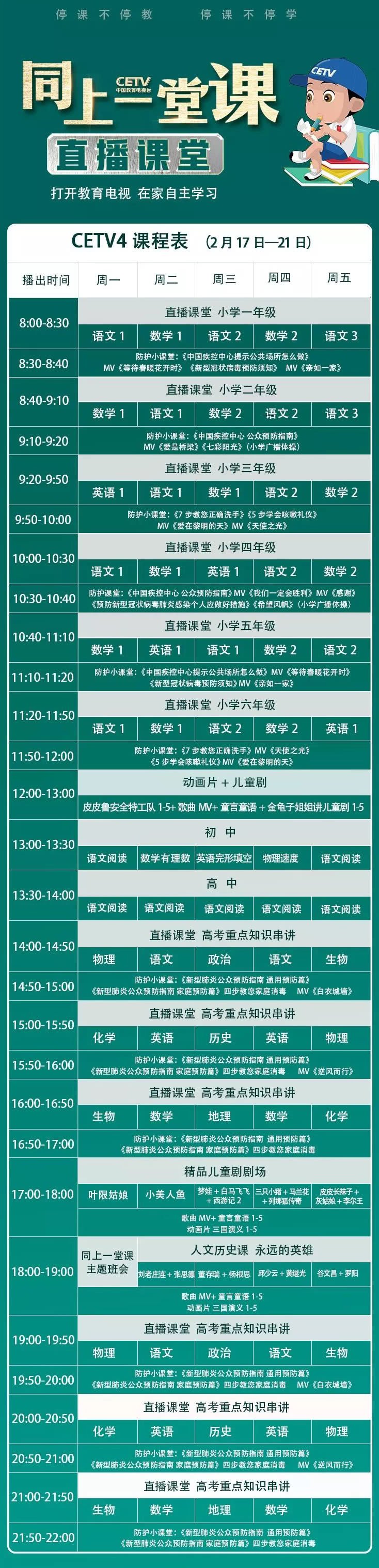 2月17日起中国教育电视台四频道(CETV4)推出大型《同上一堂课》“课表式电视课堂”,内容包括小学各年级直播课堂、部分中学课程,人文历史、国学经典、艺术欣赏、生命安全等通识教育,以及疫情防护、课间操、校园歌曲MV等文体科普教育等三大节目版块。电视课堂汇聚全国优质示范教学资源,主要覆盖小学各阶段课程,兼顾初三和高三学生的学习,同时汇聚大量历史人文及生命安全教育等优质节目内容,以模块化电视节目的编排方式,激发学生们的爱国主义情怀,培养学习兴趣,教授学习方法。电视信号通过直播卫星平台向全国各地传输,特别覆盖偏远贫困地区和网络信号比较弱及有线电视没有通达的地区,解决这些地区学生的学习资源和学习渠道问题。