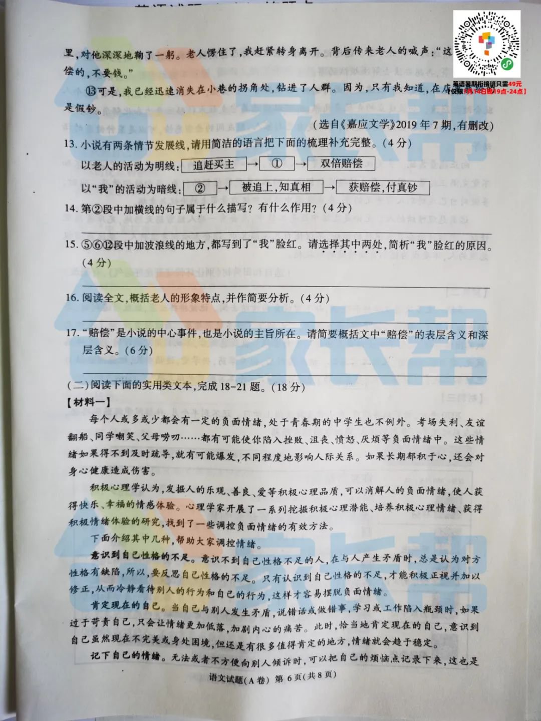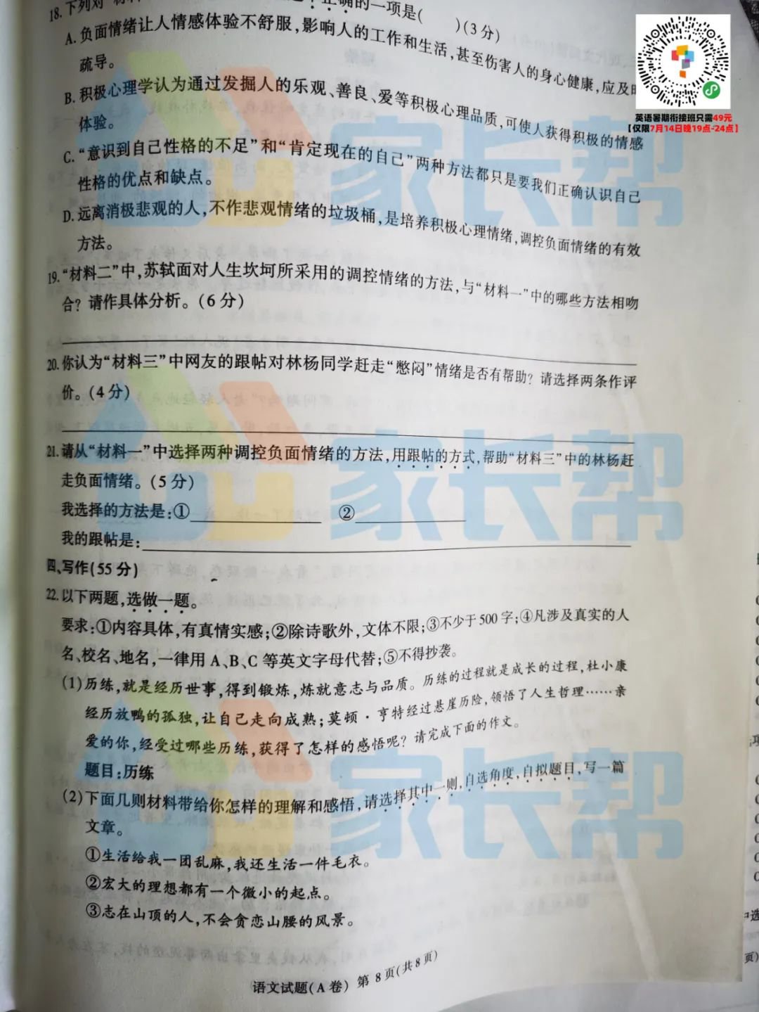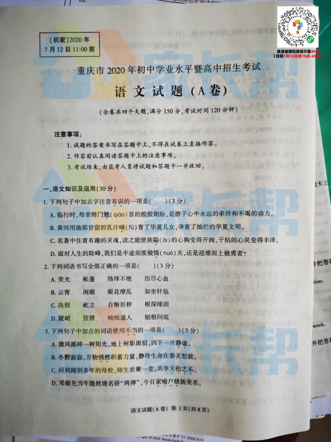 2020重庆试卷及标准答案出炉(语文A卷)