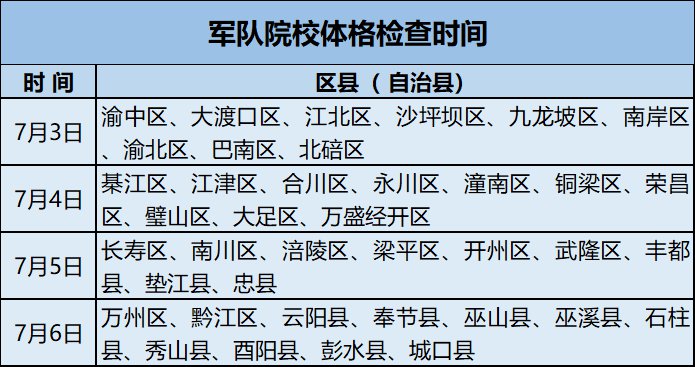 以上时间安排请考生根据本人户籍所在地对应区县(自治县)按时参加,户籍所在地为重庆市以外的按学校所在地对应区县(自治县)按时参加。凡在规定时间内未参加体格检查的考生,填报的军队院校志愿作自动放弃处理。