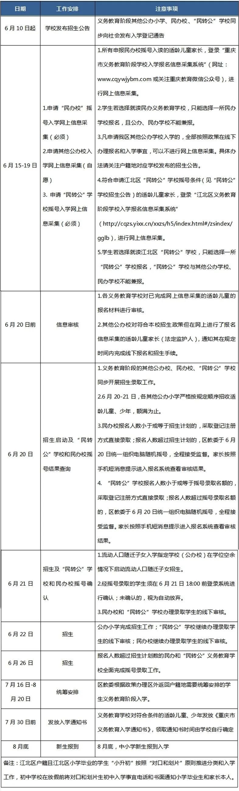 江北区户籍小学毕业生按照“对口和划片、统筹安排”方式升入本区公办初中继续完成九年义务教育。初中新生需提供小学毕业证明。