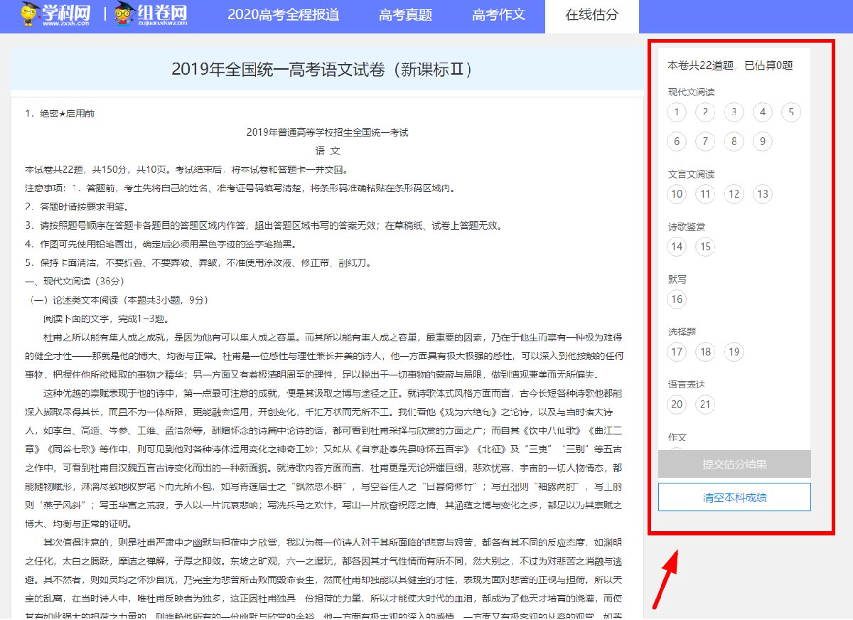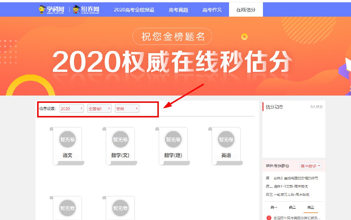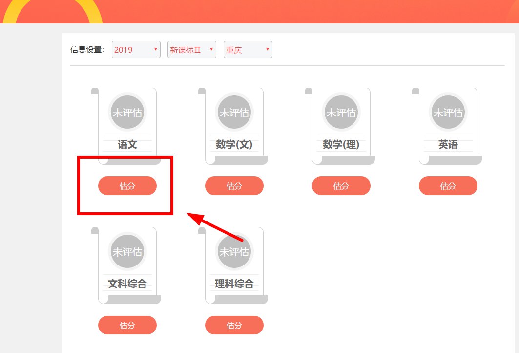 1、进入估分页面,选择你所在的地区和考试试卷类型。