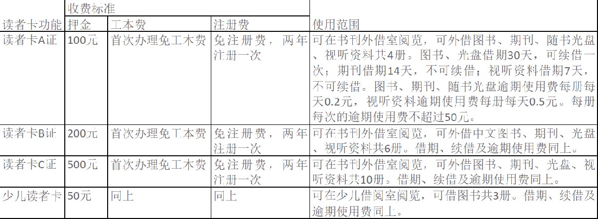 3、读者首次办理读者卡免工本费,请妥善保管读者卡,因保存不当,造成不能使用时,需重新制卡,收工本费10元。