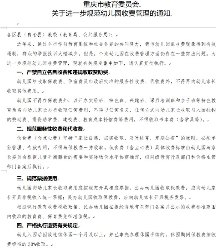 幼儿入园后因故连续休园一个月及以上,并已事先办理休园手续的,休园期间保教费按收费标准的30%收取。幼儿入园后因故要求退园或转园的,在园时间不足当月法定工作日一半(含一半)的,按在园天数计算收取保教费,超过一半的,按全月收取。学期初或学期末不足半个月的,按工作日计算收取保教费,超过一半的,按全月收取。