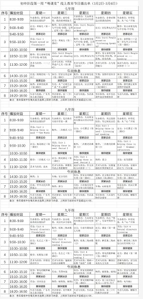 一起来了解一下3月2日-3月6日初中阶段的课程表吧!由于屏幕分辨率限制可能不太清晰。